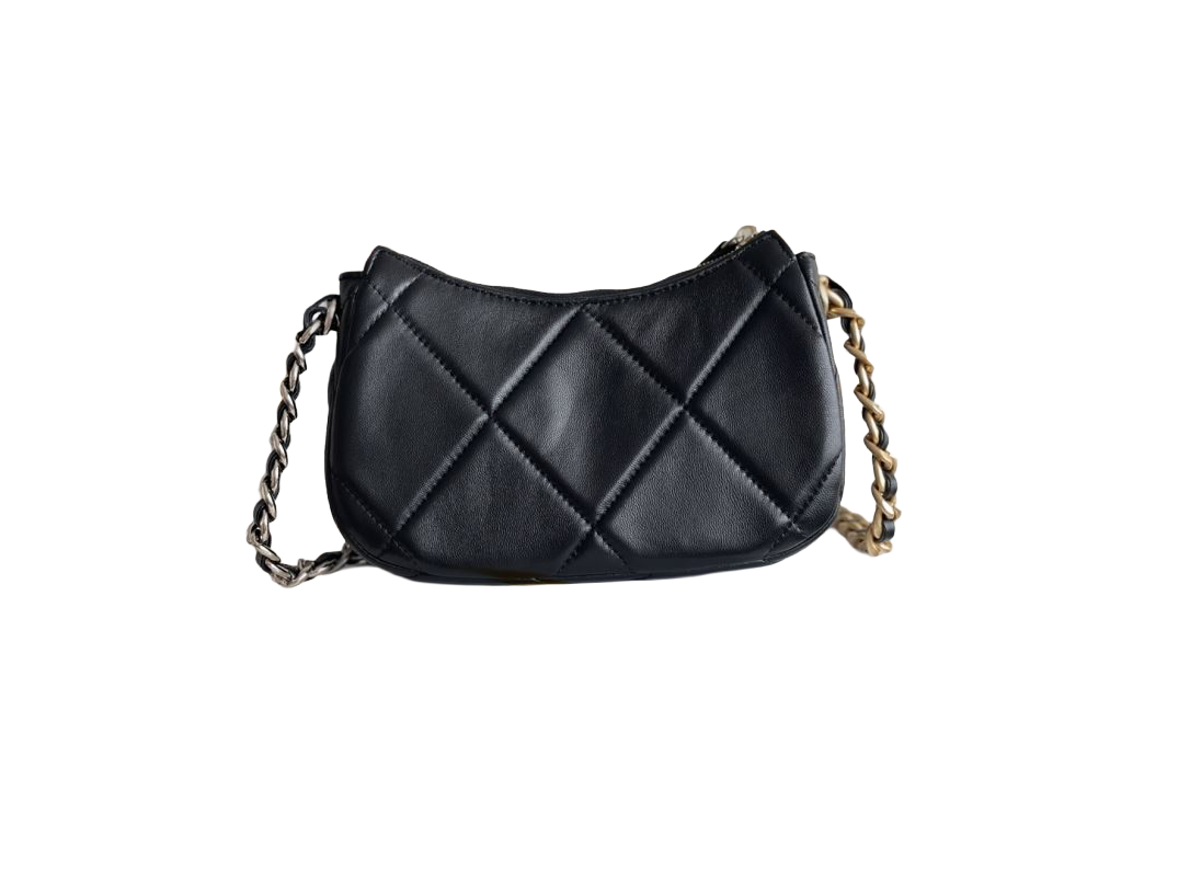 Die Chanel 19 Clutch (Modell 2025) ist aus glänzendem schwarzem Lammleder gefertigt und mit Metallbeschlägen in Gold-, Silber- und Ruthenium-Optik versehen. Die Kombination aus poliertem Leder und dreifarbigem Metall verleiht dieser Tasche einen modernen, luxuriösen Look. Mit dem ikonischen CC-Logo und einem raffinierten, kompakten Design ist sie die perfekte Abendtasche.