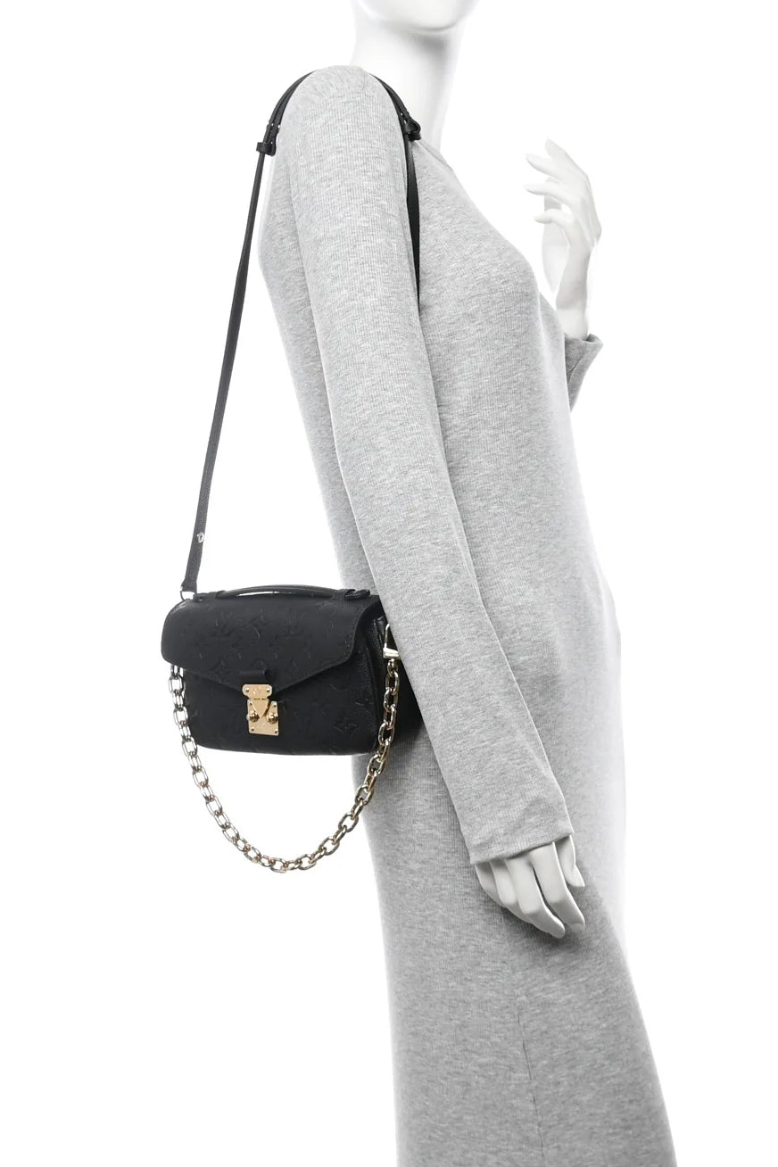 Authentische Louis Vuitton Pochette Métis East-West aus schwarzem Monogram Empreinte Leder. Ausgestattet mit dem ikonischen S-Verschluss, goldfarbenen Beschlägen, einer abnehmbaren Kette und einem verstellbaren Schulterriemen aus Leder. Kompakt, luxuriös und multifunktional mit mehreren Innenfächern und einem Reißverschlussfach auf der Rückseite. Eine elegante und zeitlose, gebrauchte Schultertasche.
